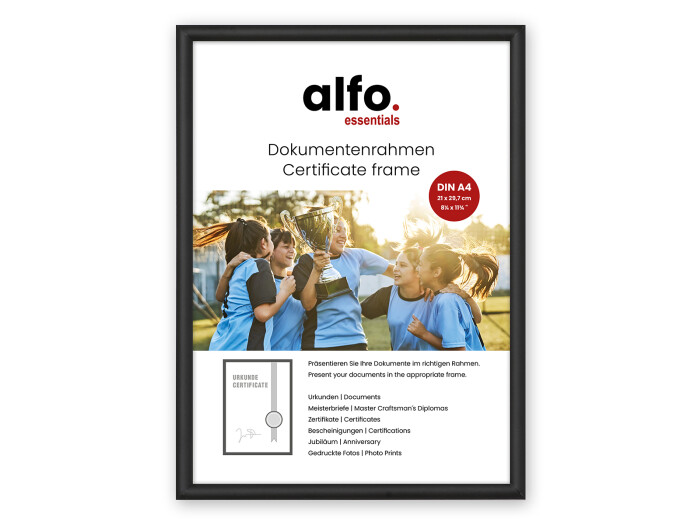Rückwand: schwarze Hartfaser-Rückwand mit praktischem Tischaufsteller für Hoch- und Querformat bis zum Format 20x30 cm, der Rahmen verfügt über einen Wandaufhänger für Hoch- und Querformat, ab Format 30x40 cm Rückwand aus stabilem MDF